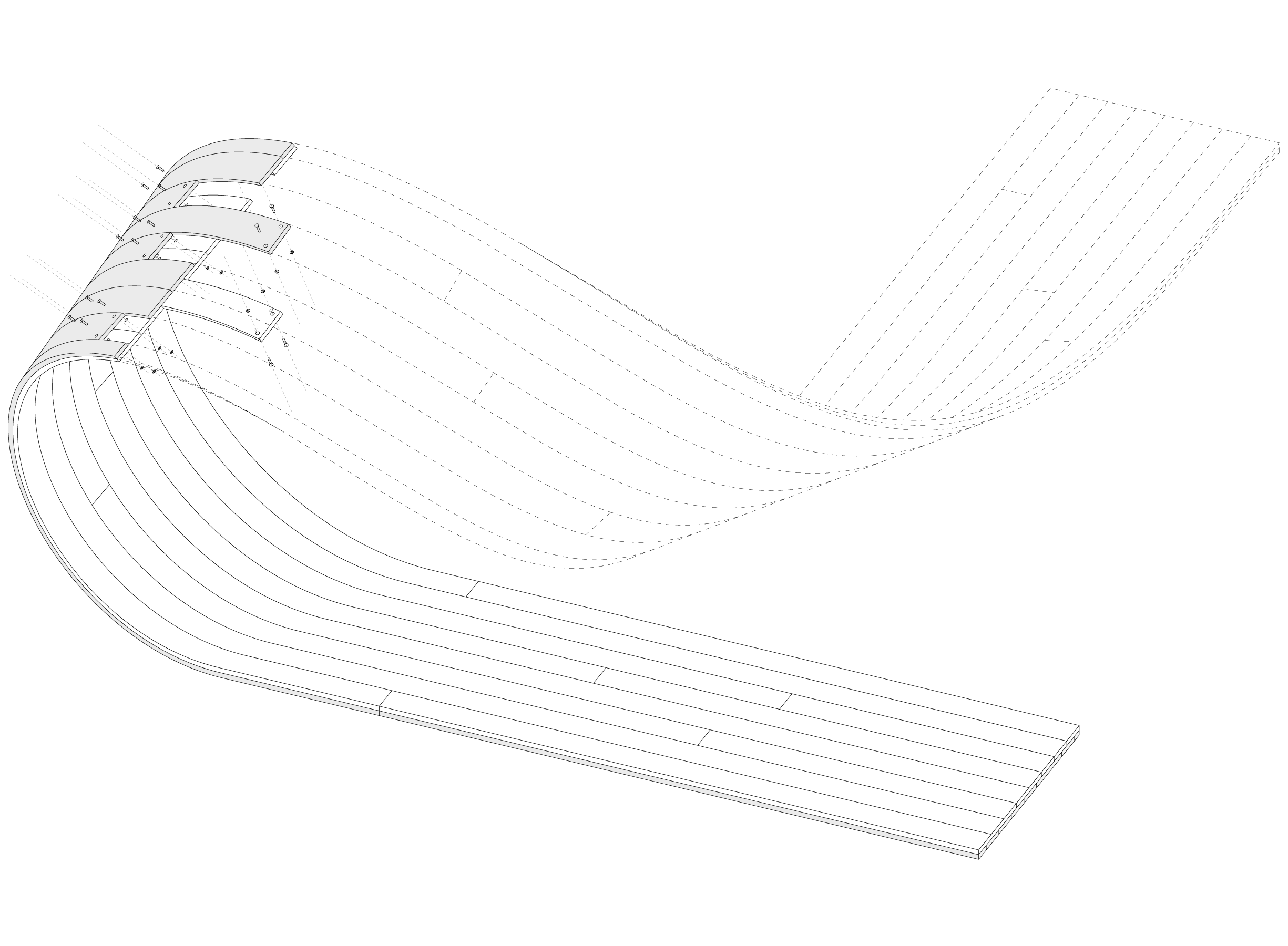 The lower surface is clad with planar plywood panels (or alternatively, bent plywood) that are continuous with the decking plane, and can be used as a seating/reclining surface. The upper surface (inverted peeling cone) is mostly structural, and is clad with a modest fabric canopy at the top for additional shading. The two intersecting surfaces (one implicit and the other explicit) share structural members (embedded in the lower surface, exposed in the upper surface).